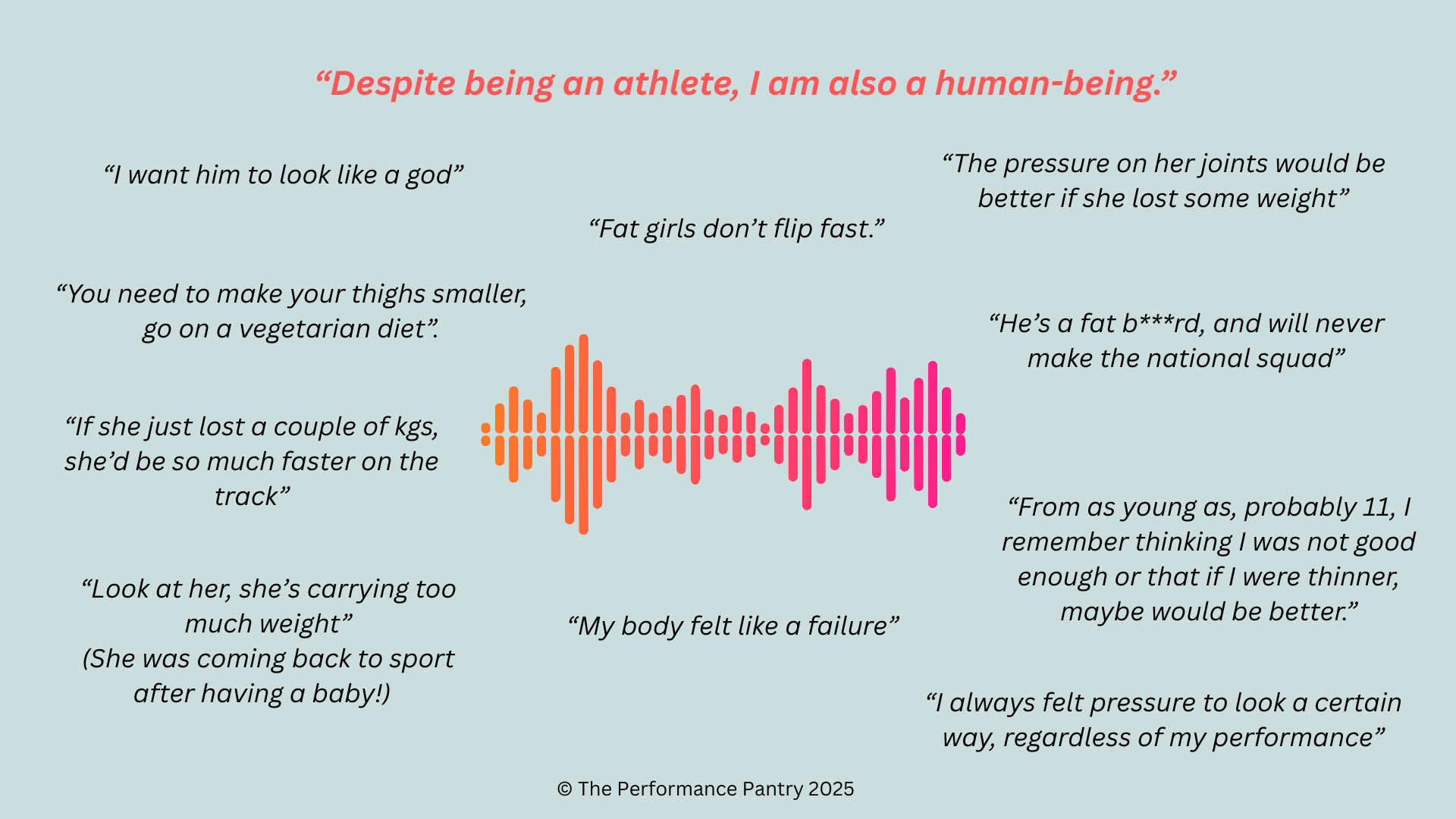 These are some examples of conversations we have come across in our work with everyday folk, high performance athletes, and staff. They are not acceptable, nor are the remarks grounded in anything else except appearance based judgement, and diet culture.